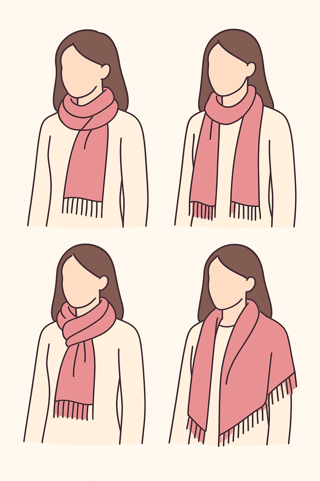 - De Doorsteeklus : De sjaal wordt dubbel geplooid, rond de hals gelegd en de uiteinden door de lus gestoken. Warm, tijdloos en ideaal voor frisse dagen.